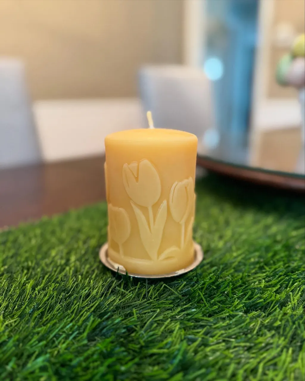 Bring the feeling of spring into your home with this charming Tulips 3"x 4" beeswax pillar!
